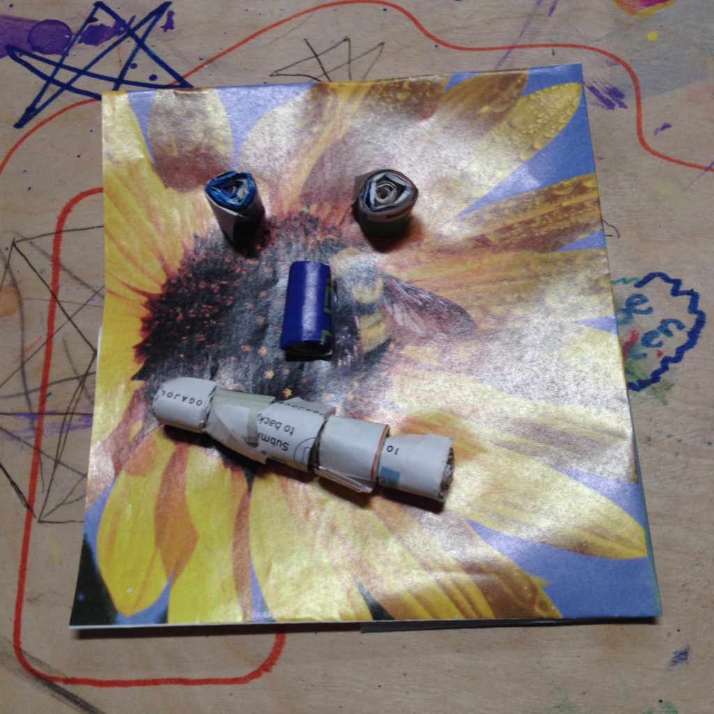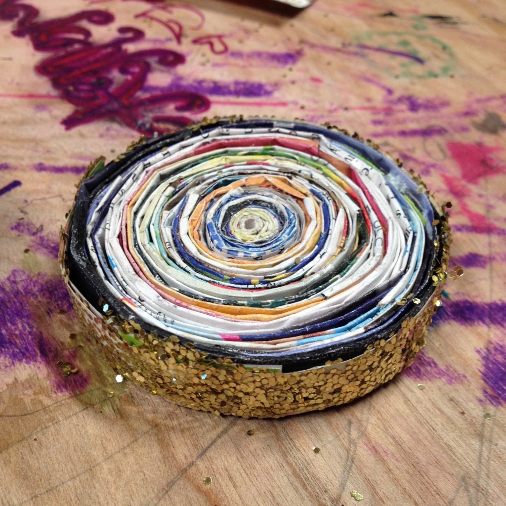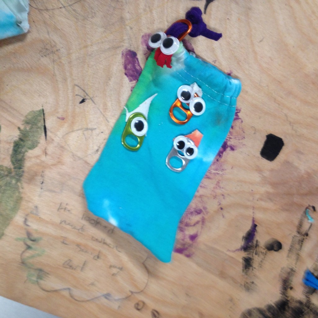 In January 2016, I had the pleasure of teaching an 8-week upcycling course to the teens at LightHouse in Holyoke, MA. LightHouse is not a typical school environment, but it’s an education model that aligns well with my family’s approach to home education and child-directed learning. Each week I brought different creative reuse projects and packed a suitcase on wheels with a variety of materials and tools. The students and I explored ways to repurpose stuff that is often discarded or less valuable in its current state. Including household waste (food cardboard, junk mail, paper, CD’s, magazines, jars & boxes) and textiles (t-shirts, jeans, scrap fabric). We also discussed the importance of reducing waste and brainstormed creative ways to reuse other materials.