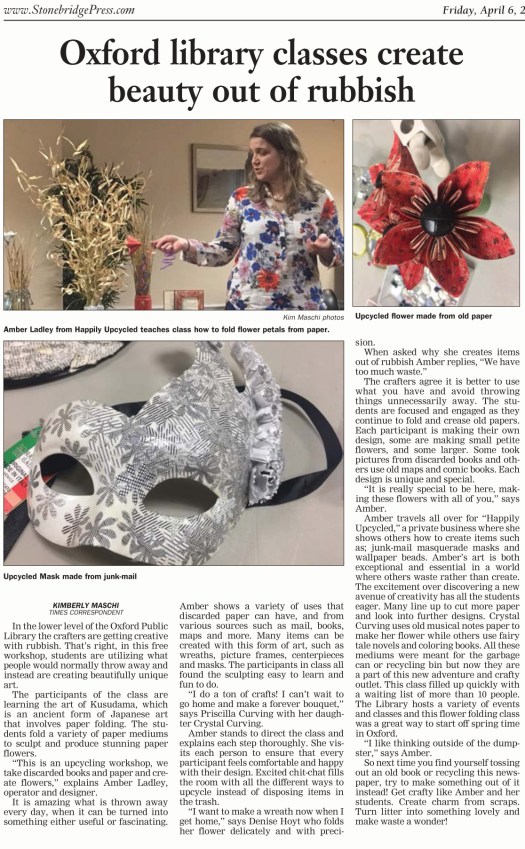 Oxford library classes create beauty out of rubbish (The Webster Times)Your Time: Kusudama workshop, Westhampton Public Library (Daily Hampshire Gazette)